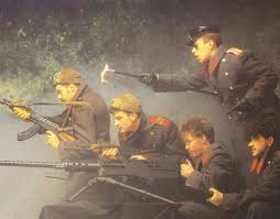 Frankie Goes To Hollywood followed up their debut monster hit "Relax", with "Two Tribes", which became the longest-running number one single in the UK between 1978 and 1991, even bringing "Relax" back up to the number two spot at the same time. The song's title is lifted from the film Mad Max 2: The Road Warrior - "When two great warrior tribes go to war" - and is a commentary on the strained relationship between USA and the Soviet Union at the time of its 1984 release, near the end of the cold war. The Godley & Creme-directed music video features actors portraying Ronald Reagan and Konstantin Chernenko fighting it out - dirty, I might add - in a pit surrounded by world leaders from around the globe. The clip you'll see here is the so-called "Video Destructo" version, opening with cut-up monologues featuring Richard Nixon, John F. Kennedy, Yasser Arafat and others.